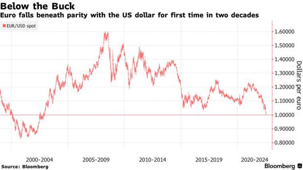 智通财经APP获悉,今年以来,欧元经历了一次迅速而猛烈的暴跌,更是在近日跌至与美元平价,这是20多年来首次。