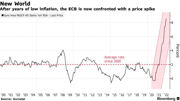 考虑到2月份时欧元兑美元还接近1.15,欧元的贬值速度之快令人难以置信。这种螺旋式下跌并不像本世纪欧元刚刚起步时的那种暴跌、或十年前欧债危机时那样伴随着欧元的生死存亡。不过,对于欧洲央行来说,这仍然是一个问题。此外,欧元下跌加剧了欧元区本就失控的通胀,物价以创纪录的速度上涨了近9%。