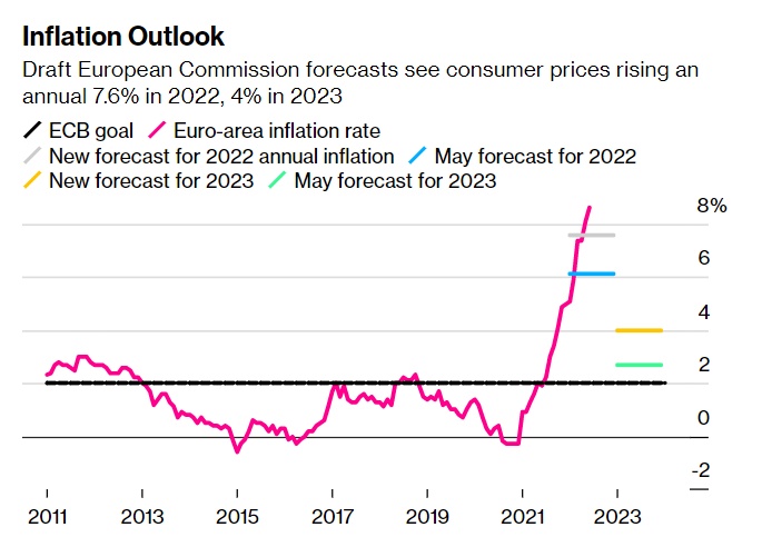 通胀率已经达到创纪录的水平,是欧洲央行2%目标的四倍多,现在预计2022年为7.6%,明年为4%,高于原预期值6.1%和2.7%。但在周四正式公布预测之前,这些数据仍可能发生变化。