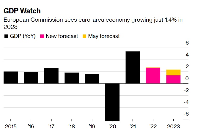 根据欧盟执行机构的新预测,由于物价飙升压制了需求,冬季能源短缺危机消耗了信心,今年欧盟GDP可能增长2.6%,2023年将增长1.4%,低于5月份预测的2.7%和2.3%。