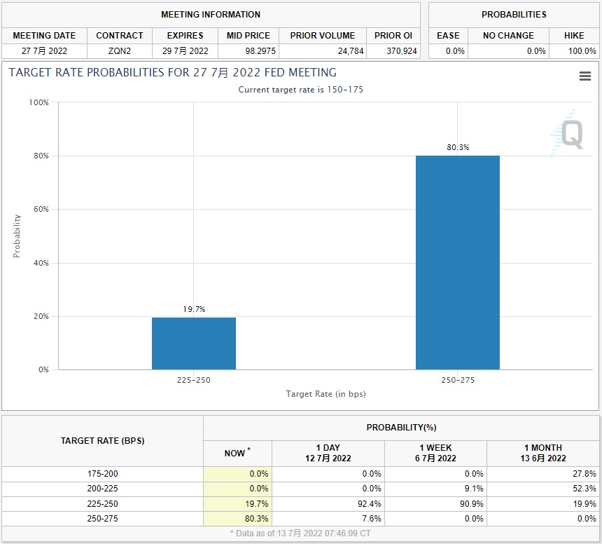 这些言论加剧了市场对美联储在7月加息100个基点的押注。根据芝加哥商品交易所集团(CME)的FedWatch工具的最新数据,截至发稿,美联储7月份加息75个基点的概率为19.3%、低于一天前的92.4%,而7月加息100个基点的概率则从一天前的7.6%飙升至80.3%。