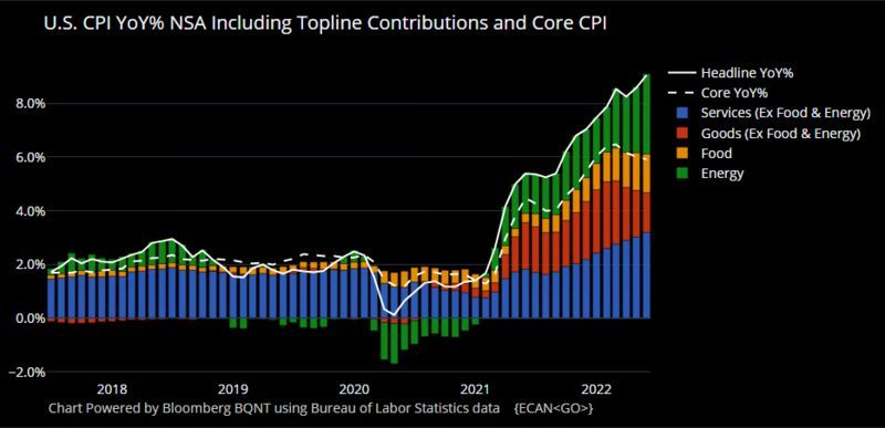 美国劳工部当地时间周三公布的数据显示,美国6月消费者价格指数(CPI)较上年同期上涨9.1%,继续创1981年年底以来的最大涨幅,市场预期为8.8%。同样广受关注的环比通胀指标较上月增长1.3%,为2005年以来的最高水平,反映出汽油、住房和食品价格不断上涨。