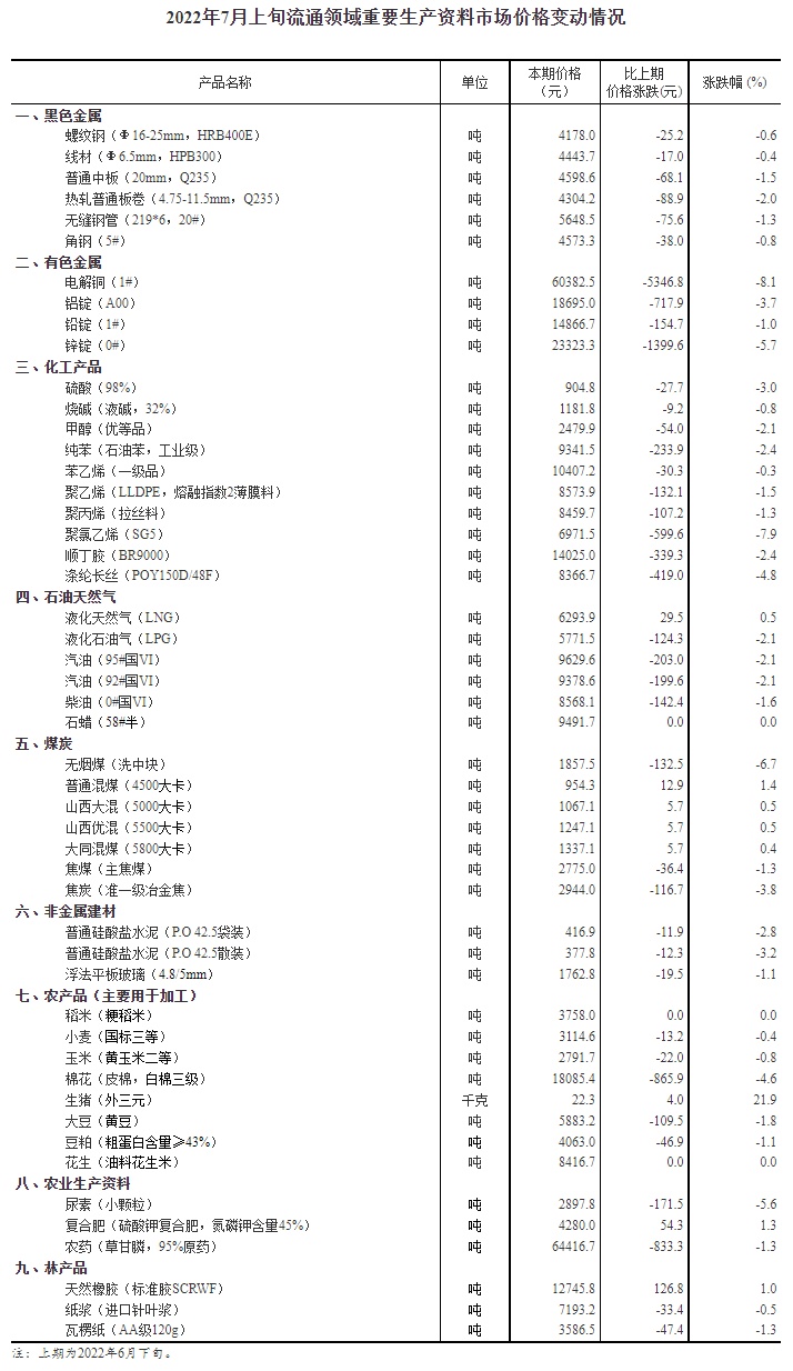 智通财经APP获悉,7月14日,国家统计局据对全国流通领域9大类50种重要生产资料市场价格的监测显示,2022年7月上旬与6月下旬相比,8种产品价格上涨,39种下降,3种持平。