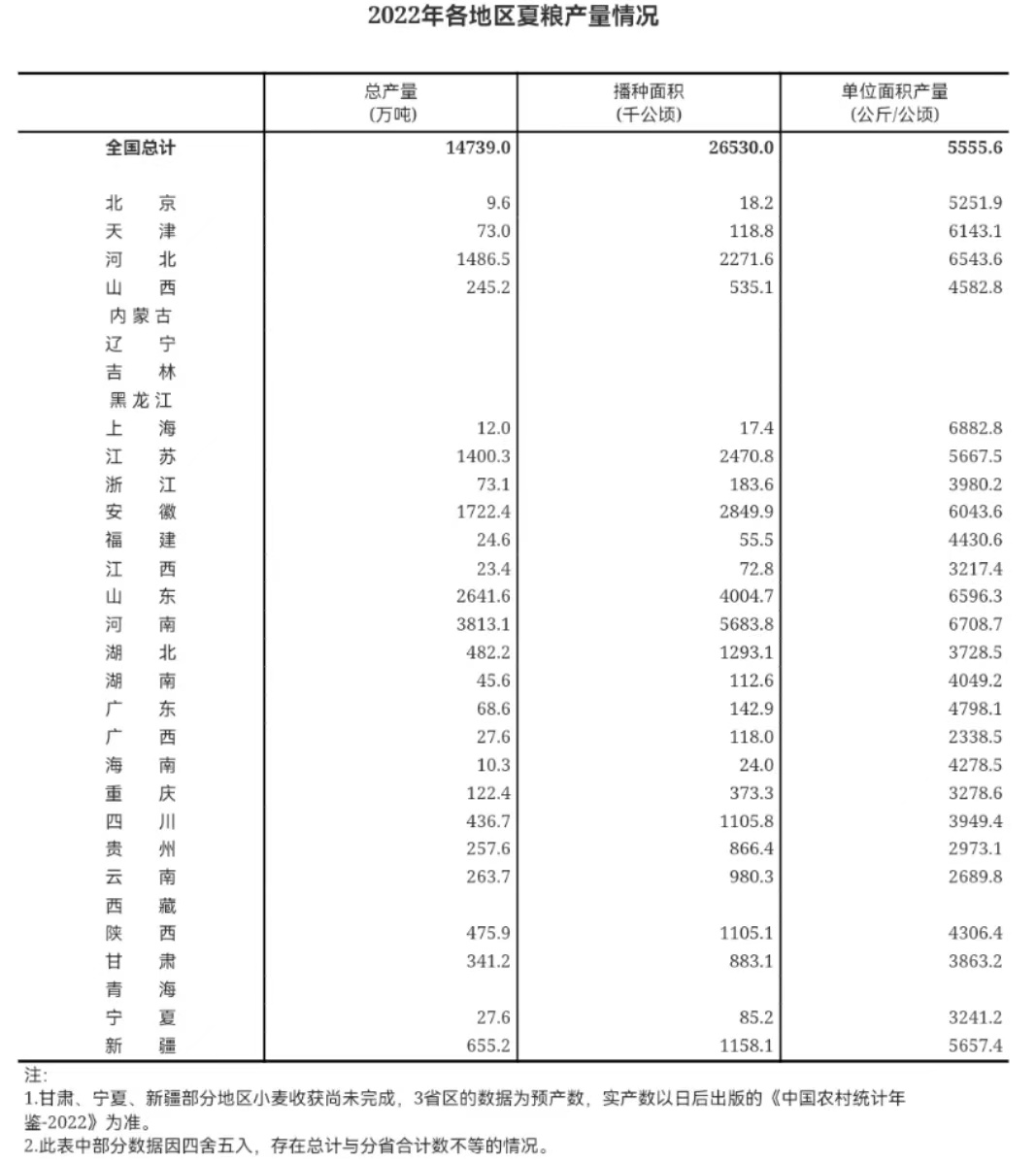 根据对全国25个夏粮生产省(区、市)的调查,2022年全国夏粮播种面积、单位面积产量、总产量如下: