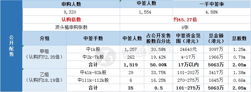 其中,公开配售申购人数9320人,一手中签率4.88%,认购倍数约45.27倍。