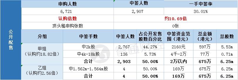 其中,公开配售申购人数6721人,一手中签率30.01%,认购倍数约10.69倍。