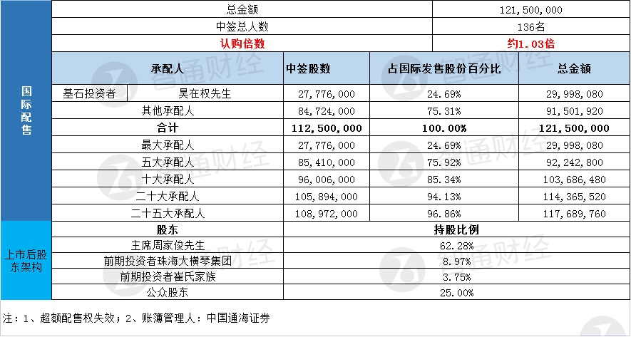 国际配售申购人数未披露,认购倍数约1.03倍。