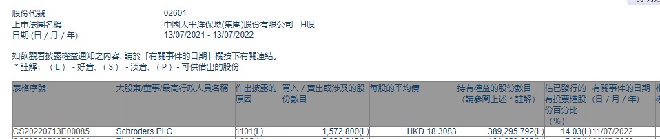 PLC增持中国太保(02601)157.28万股,每股作价18.3083港元,总金额约为2879.53万港元。增持后最新持股数目约为3.893亿股,最新持股比例为14.03%。