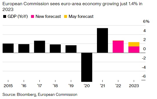 智通财经APP获悉,欧盟委员会周四发布了关于经济增长和通胀的最新预测,将2023年的经济增长预测从2.3%下调至1.4%;预计今年的通胀为7.6%,高于此前预测的6.1%,而2023年的平均值为4%。此次预测的修正表明,由于俄乌战争等因素,欧洲经济相比两个月前面临着明显放缓的前景以及范围更广且时间更久的通胀冲击。