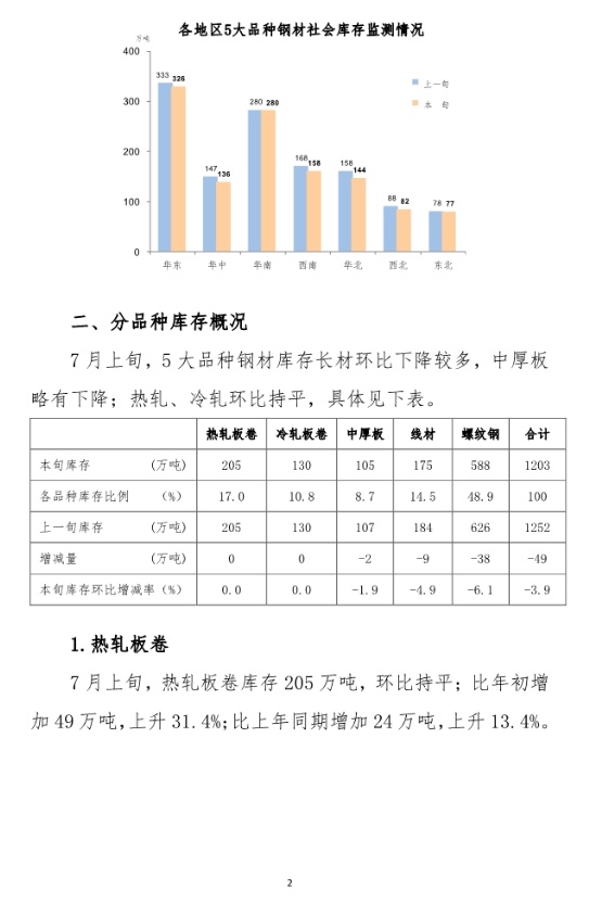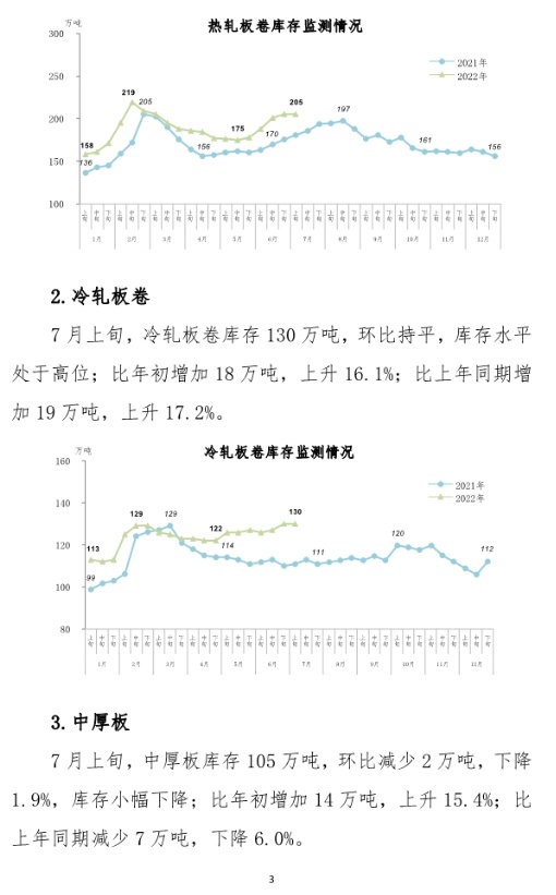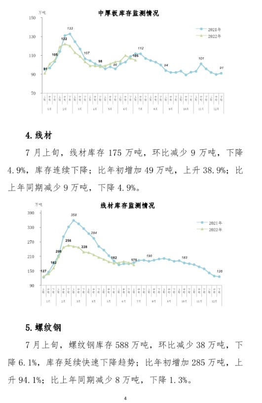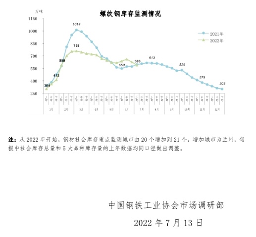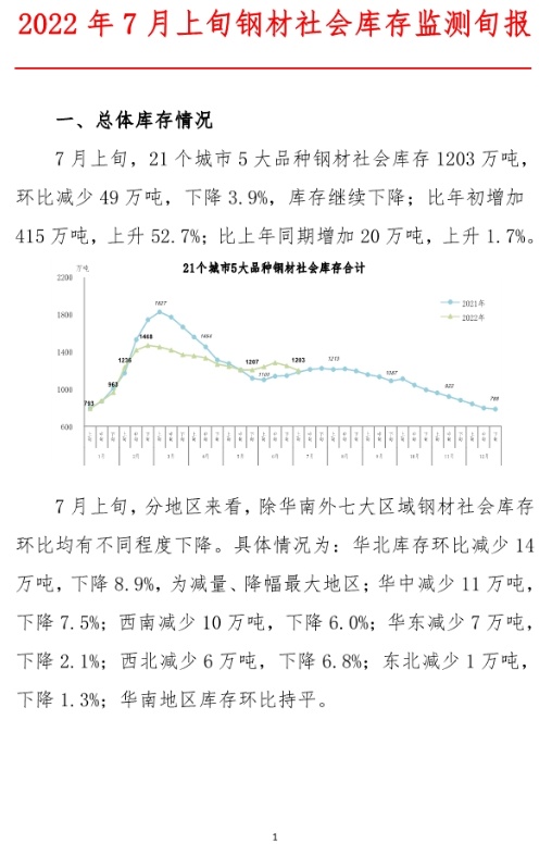 智通财经APP获悉,7月14日,中国钢铁工业协会发布《2022年7月上旬钢材社会库存监测旬报》。数据显示,7月上旬,21个城市5大品种钢材社会库存1203万吨,环比减少49万吨,下降3.9%,库存继续下降;比年初增加415万吨,上升52.7%;比上年同期增加20万吨,上升1.7%。7月上旬,热轧板卷库存205万吨,环比持平;比年初增加49万吨,上升31.4%;比上年同期增加24万吨,上升13.4%;7月上旬,螺纹钢库存588万吨,环比减少38万吨,下降6.1%,库存延续快速下降趋势;比年初增加285万吨,上升94.1%;比上年同期减少8万吨,下降1.3%。