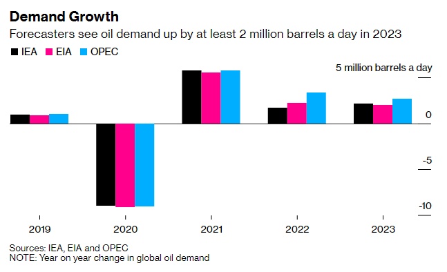 欧佩克认为,这一增长将使全球石油需求在2023年达到平均每天1.03亿桶。IEA和EIA的数据分别为每天1.013亿桶和1.016亿桶。
