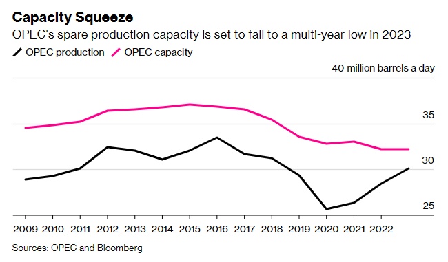 根据欧佩克自己的数据,这不是该组织的创纪录产量水平,但将是自2018年以来的最高水平。更重要的是,根据彭博社对欧佩克国家可持续生产能力的评估,这将把该组织的闲置产能推至多年来的低点,约为每天200万桶。
