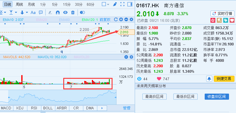 不过近几日南方通信的股价有点犹豫,2017年8月11日小幅回调之后,进入了横盘程序。值得注意的是在2017年8月20日,南方通信发布中期业绩,营收为4.14亿元,同比仅增长8%,当天股价收盘反应下跌3.37%至2.01港元。南方通信2017年低速增长的中期业绩令市场投资者迟疑剁手,这或许给它的股价带来趋势的不确定性。