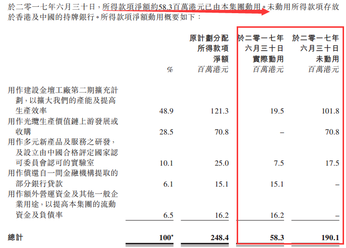 智通财经APP观察到,截止2017年上半年,该公司于2016年12月份上市募得资金2.856亿港元,目前投入的仅有0.583亿港元,主要用于清偿债务和提供运营资金,还剩1.901亿港元没有动用。该公司扩产计划进展的还算顺利,2017年上半年动用了0.195亿港元,占比该年份计划金额的66%,不过光缆价值链上游的收购并没有动用计划资金。