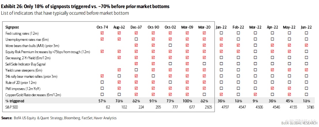“我们的经济学家预计,美联储将在2023年第三季度首次降息。通常情况下,这些指标中有70%以上是在市场触底之前触发的。目前,只有18%的指标被触发。”