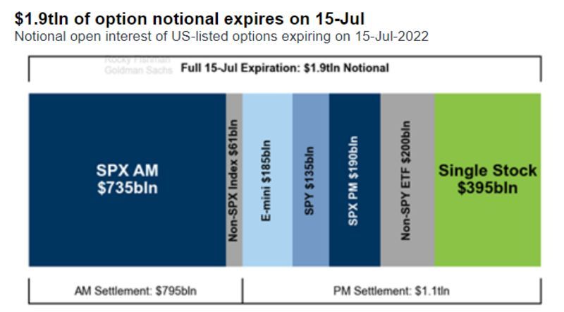 高盛估计,共计1.9万亿美元的期权将到期,迫使投资者要么滚动现有头寸,要么开始新的头寸。大约有包括价值为9250亿美元的标普500指数挂钩合约和价值为3950亿美元的单一股票衍生品计划到期。