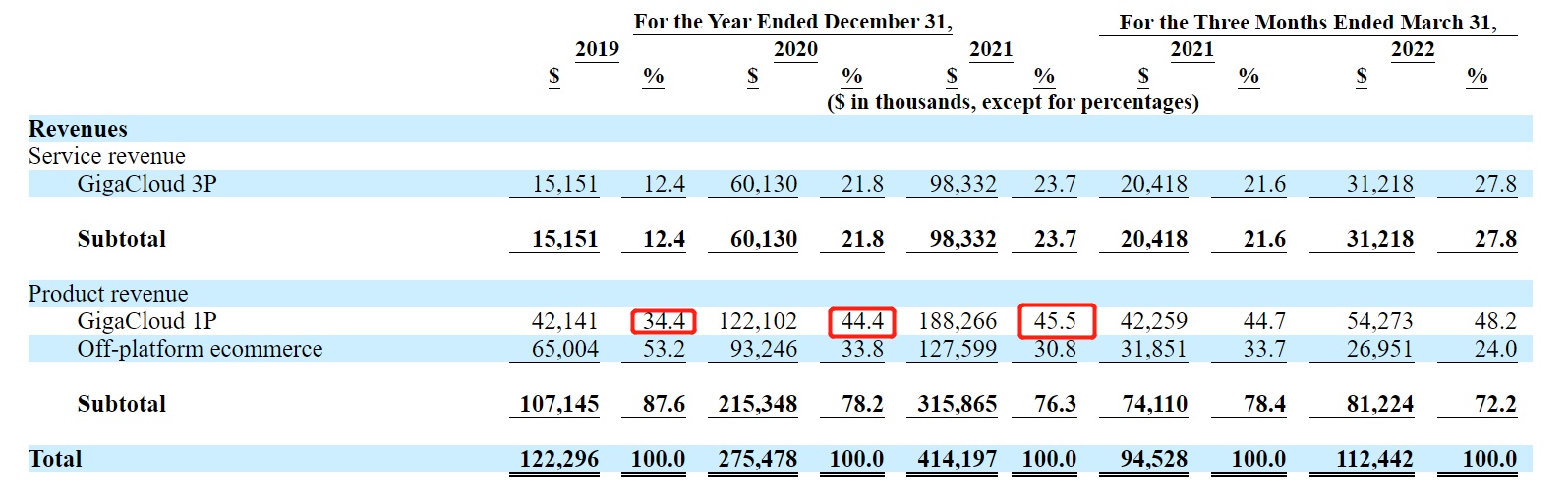 从收入来看,无论是平台内收入或是平台外收入,均实现了快速增长,但整个收入结构向平台内提升的趋势十分明显。据招股书显示,2019至2021年,大健云仓的产品收入占比分别为87.6%、78.2%、76.3%,其中,1P收入占比持续提升,分别为34.4%、44.4%、45.5%。
