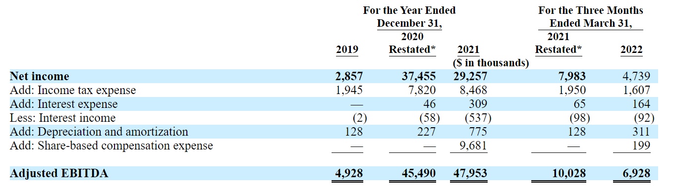 为体现公司正常的盈利水平,大健云仓在招股书中引入了调整后的EBITDA指标。数据显示,2019至2021年,大健云仓调整后的EBITDA分别为492.8万美元、4549万美元、4795.3万美元,实现持续增长,但2022年第一季的调整后EBITDA下滑30%至692.8万美元。