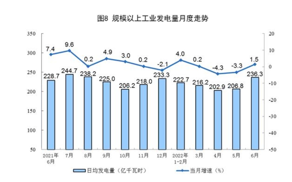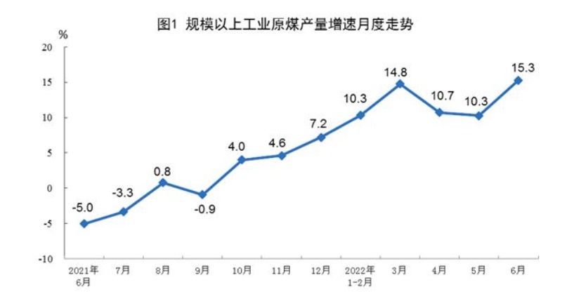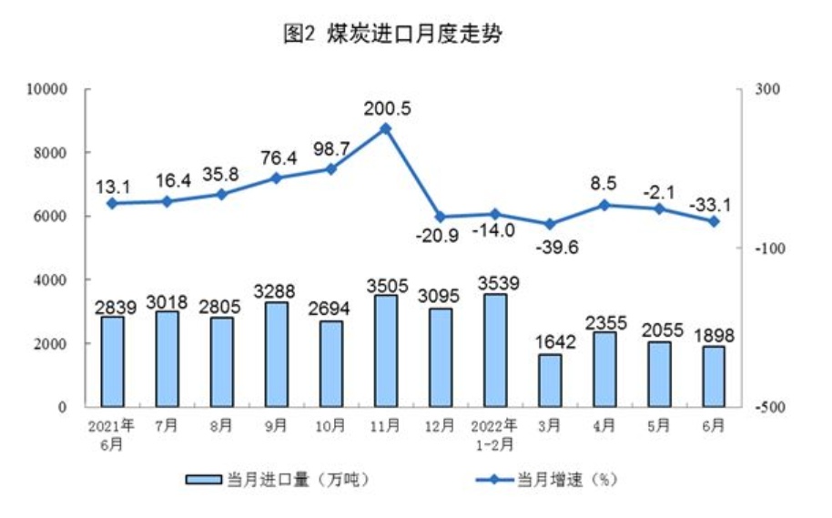 原煤生产增速加快,进口降幅扩大。煤炭保供政策有力推进,6月份,生产原煤3.8亿吨,同比增长15.3%,增速比上月加快5.0个百分点,日均产量1264万吨。进口煤炭1898万吨,同比下降33.1%,降幅比上月扩大31.0个百分点。