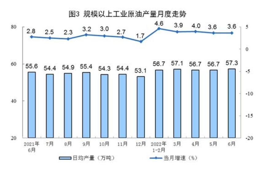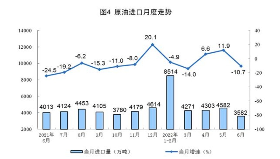 原油生产稳定增长,进口由升转降。6月份,生产原油1719万吨,同比增长3.6%,增速与上月持平,日均产量57.3万吨。进口原油3582万吨,同比下降10.7%,上月为增长11.9%。