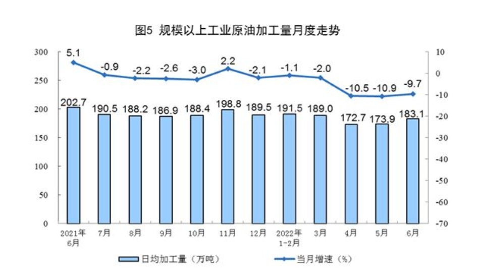 原油加工量降幅收窄。6月份,加工原油5494万吨,同比下降9.7%,降幅比上月收窄1.2个百分点,日均加工183.1万吨。1—6月份,加工原油33222万吨,同比下降6.0%。