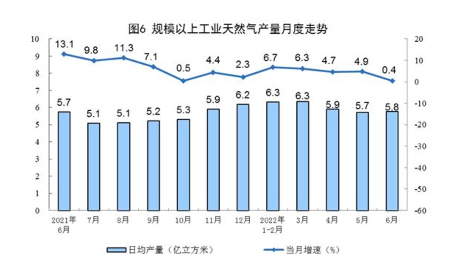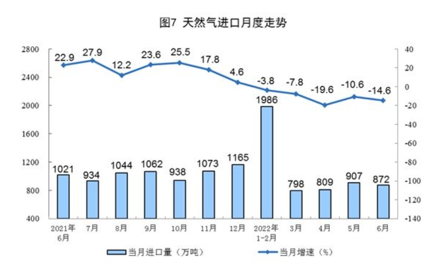 1—6月份,生产天然气1096亿立方米,同比增长4.9%。进口天然气5357万吨,同比下降10.0%。