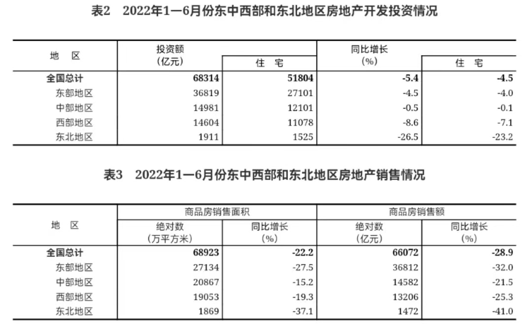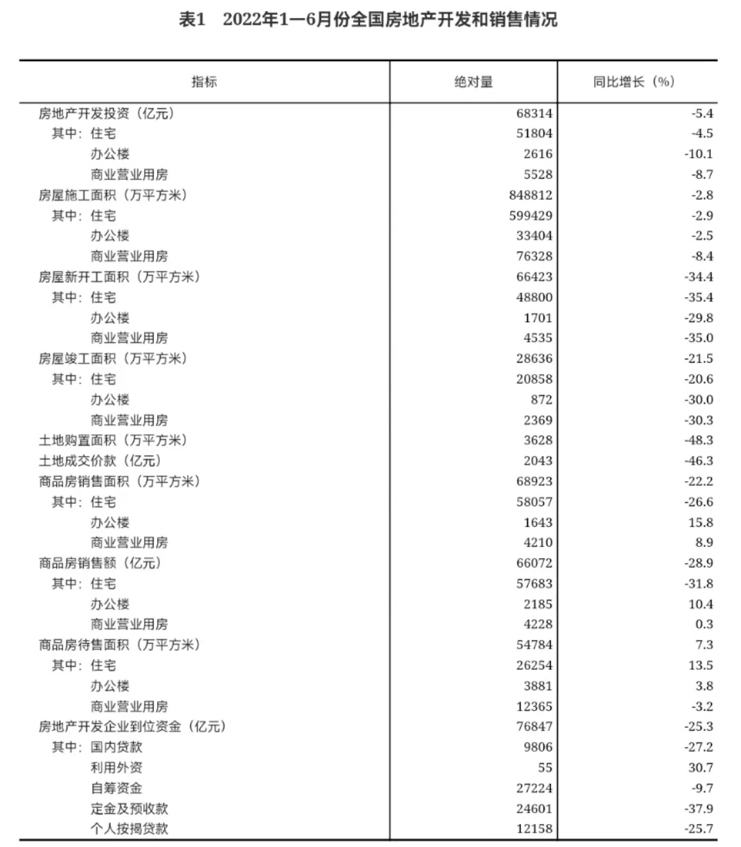 1—6月份,房地产开发企业房屋施工面积848812万平方米,同比下降2.8%。其中,住宅施工面积599429万平方米,下降2.9%。房屋新开工面积66423万平方米,下降34.4%。其中,住宅新开工面积48800万平方米,下降35.4%。房屋竣工面积28636万平方米,下降21.5%。其中,住宅竣工面积20858万平方米,下降20.6%。