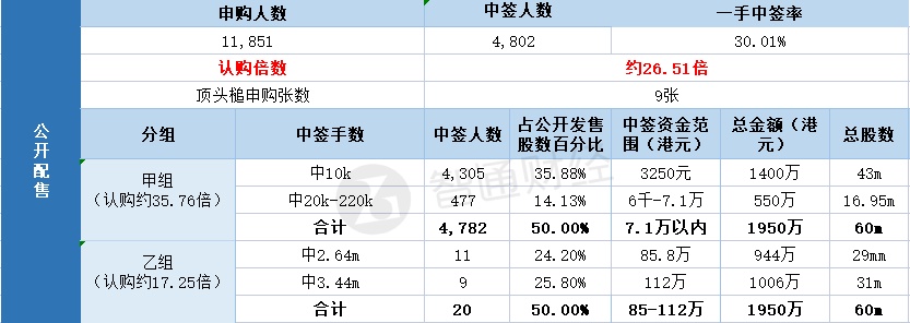 其中,公开配售申购人数11,851人,一手中签率30.01%,认购倍数约26.51倍。