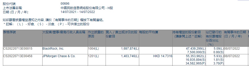 智通财经APP获悉,香港联交所最新资料显示,7月8日,小摩减持中国民航信息网络(00696)140.3746万股,每股作价14.7316港元,总金额约为2067.94万港元。减持后最新持股数目约为5535.40万股,最新持股比例为5.93%。