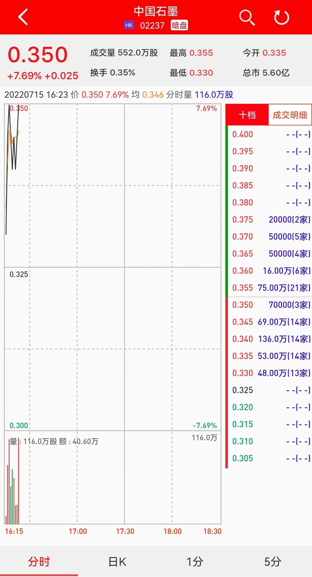 智通财经APP获悉,中国石墨(02237)将于7月18日(星期一)在香港挂牌。截至发稿,利弗莫尔证券暗盘交易显示报价0.350港元,较招股价0.325港元涨7.69%。每手10000股,不计手续费,每手赚250港元。