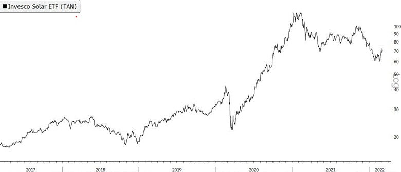截至发稿,Invesco太阳能ETF(TAN.US)今年以来的跌幅为7.57%,好于标普500指数超过20%的跌幅。