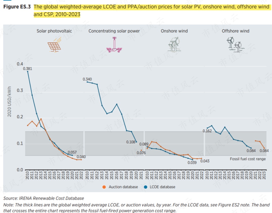 值得一提的是,光伏行业的成本在过去20年里大幅下降,这使得太阳能已经成为最便宜的能源之一。国际可再生能源机构 (IRENA)的数据显示,2010-2020年里,光伏发电的每度电成本从0.381美元降至了0.057美元,降幅达到85%。