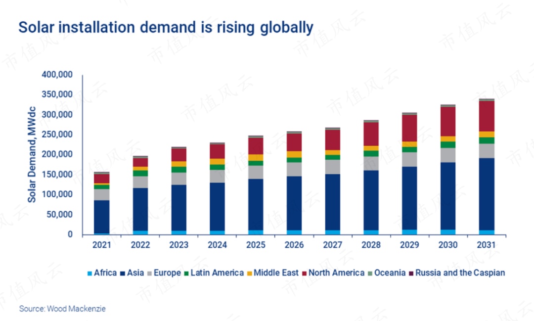 好消息是,成本的增加以及潜在的运营、维护成本的提高似乎尚未对全球太阳能市场的发展产生影响。全球能源和金属行业最权威的咨询机构Wood Mackenzie最新预测,2022年光伏新增装机量同比增长25%至197GW,累计装机量将超过1000GW。该机构还预计,未来十年全球光伏装机量平均复合年增长率为8%,到2031年,全球总装机容量将达到3500GW。