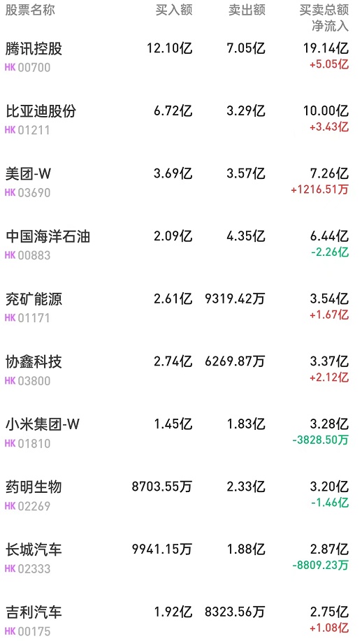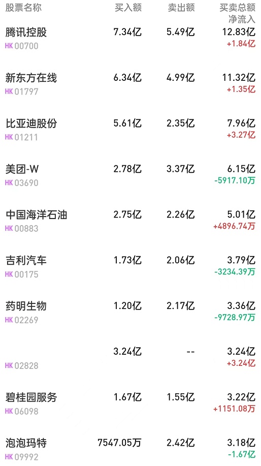 此外,恒生中国企业(02828)、新东方在线(01797)、碧桂园服务(06098)分别获净买入3.24亿、1.35亿、1151万港元。而中海油(00883)遭净卖出1.77亿港元。