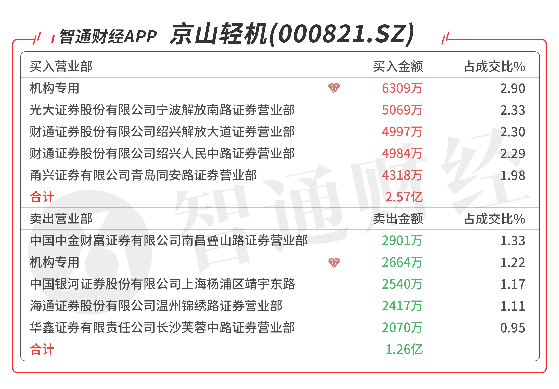 京山轻机(000821.SZ):多主力现身龙虎榜,机构席位买入6229万元,买二是知名游资宁波解放路的席位买入5062万元,当日净买入1.76亿元,该股今日放量反包,注意上方抛压。