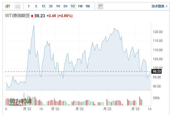 截至发稿,WTI原油上涨2.56%,报98.23美元/桶。
