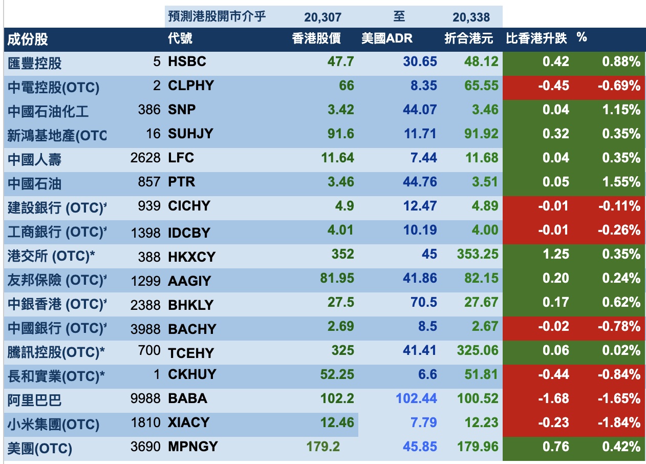 智通财经APP获悉,周五,美股三大指数集体大涨,港股ADR指数微涨,按比例计算,收报20307点,较香港收市涨9.82点或0.05%。