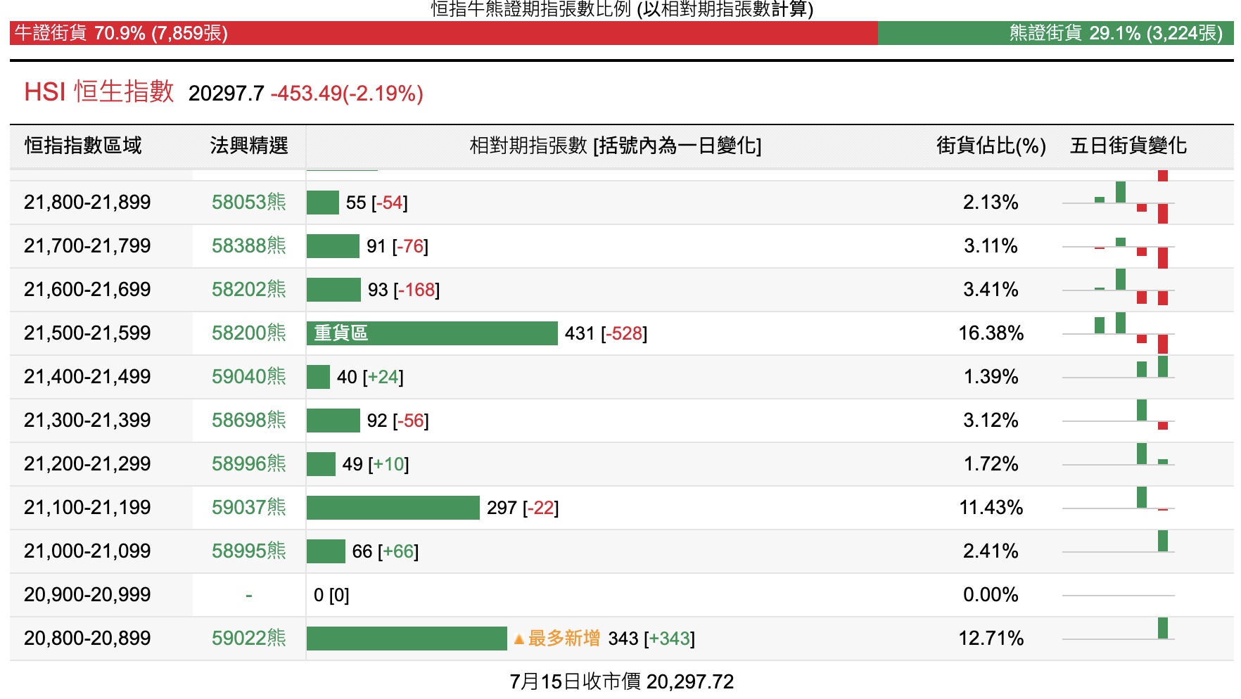 法兴恒指牛熊证街货分布图中的数据显示,熊证街货重货区在21500-21599区间,该区间最新熊证数量为431张,较上一交易日减少528张;最多新增在20800-20899区间,该区间最新熊证数量为343张,较上一交易日增加343张。