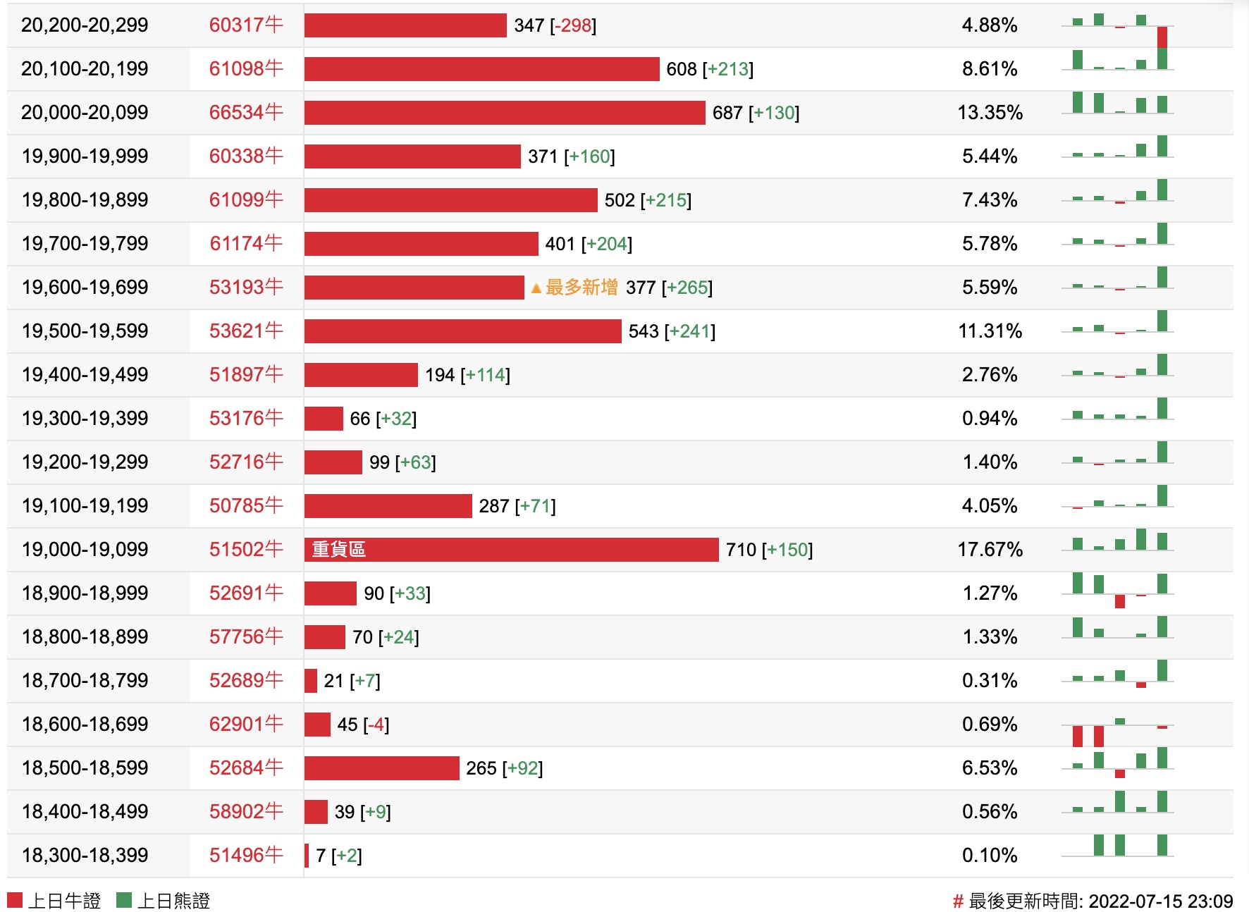 牛证街货重货区在19000-19099区间,该区间最新牛证数量为710张,较上一交易日增加150张;最多新增在19600-19699区间,该区间最新牛证数量为377张,较上一交易日增加265张。