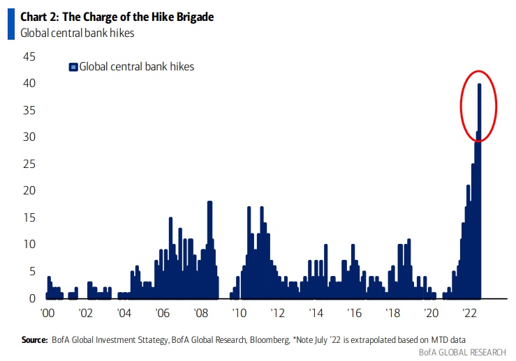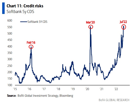 “全球各大央行密集加息周期可能会影响目前市场普遍认为轻度衰退的看法,随着未来几个月央行们试图跟随美联储开启大幅加息周期,新一轮大幅加息有可能导致‘衰退冲击’演变为信贷事件(美元走势暗示了这一点)。”Hartnett写道。他补充称,在私募股权和风险投资等领域,清算、去杠杆和违约风险非常高,如统计的软银信用违约互换图表所示。
