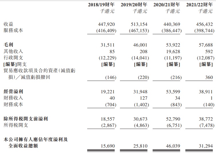 财务方面,于2018/19财年、2019/20财年、 2020/21财年及2021/22财年,集团的收益约为4.48亿港元、5.13亿港元、4.40亿港元及4.56亿港元;同期,经营溢利约为1922.1万港元、3194.8万港元、5359.9万港元及3891.1万港元。