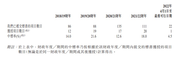 下表为集团2018/19财年、2019/20财年、 2020/21财年及2021/22财年已递交标书的项目数目、获授项目数目及中标率: