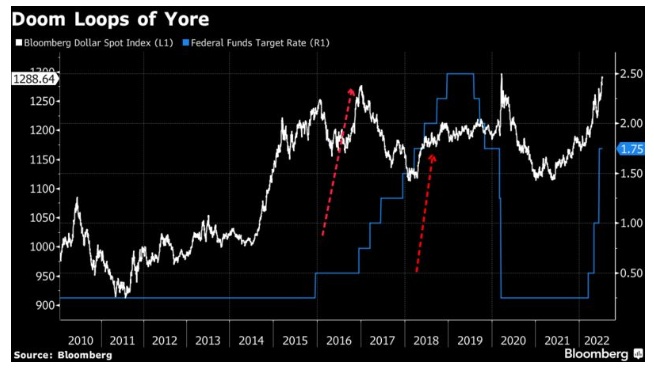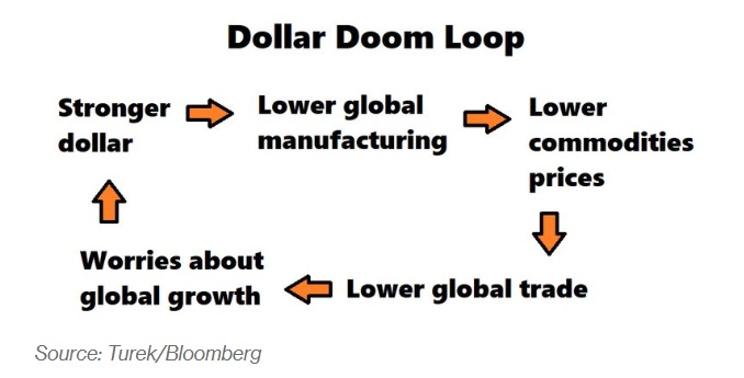 近期,对全球经济增长的担忧使彭博美元指数创下历史最高水平,美元兑欧元和日元等货币的汇率创下了数十年来新高。然而,当前似乎没有什么能逆转这一走势。鉴于绝大多数跨境贸易仍以美元计价,且美元走强历来会对全球经济造成广泛冲击,美元这一走势很有可能会成为一个自我强化的反馈回路。