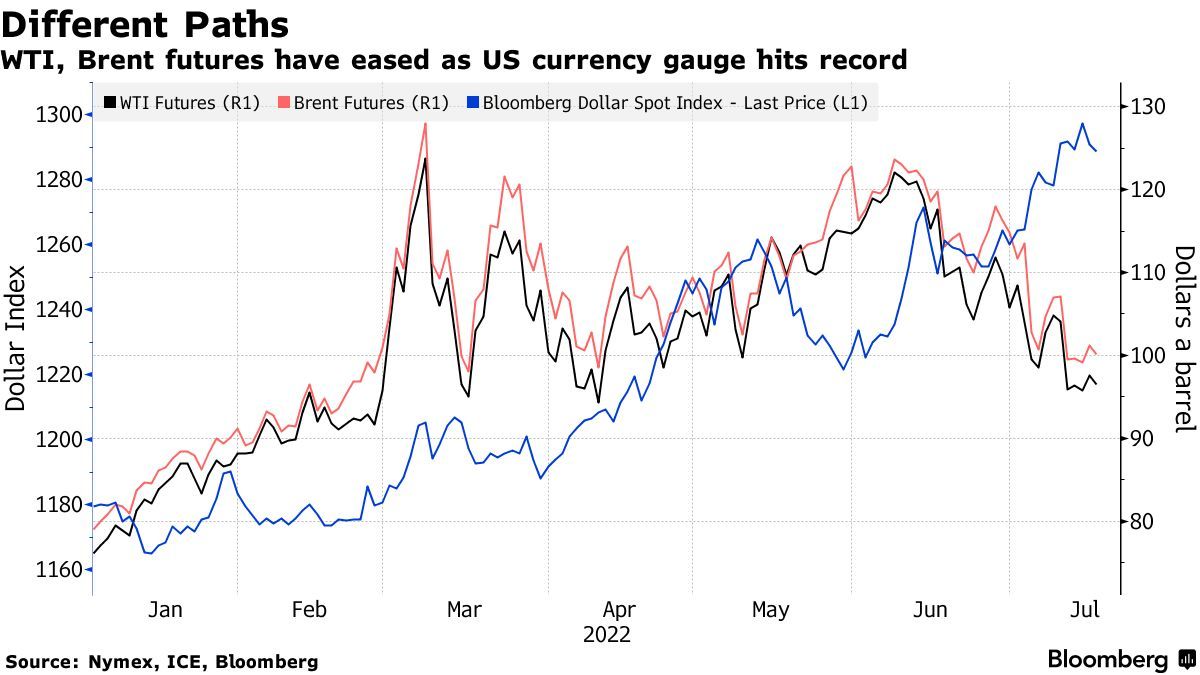 随着美元指数触及创纪录水平,WTI和布伦特原油期货价格均大幅回落