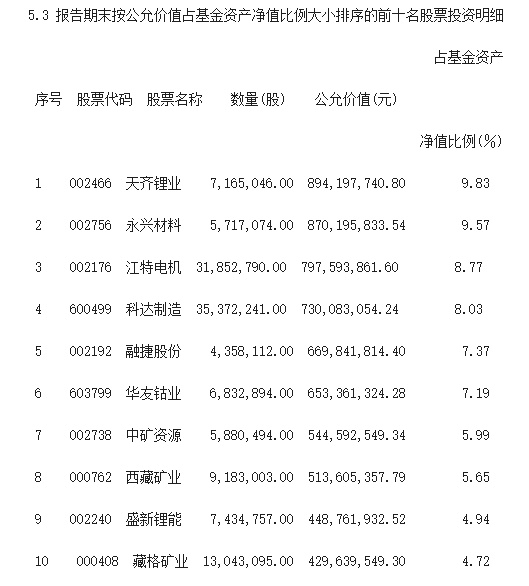 截至二季度末,国投瑞银新能源混合前十大重仓股分别为:天齐锂业(002466.SZ)、永兴材料(002756.SZ)、江特电机(002176.SZ)、科达制造(600499.SH)、融捷股份(002192.SZ)、华友钴业(603799.SH)、中矿资源(002738.SZ)、西藏矿业(000762.SZ)、盛新锂能(002240.SZ)、藏格矿业(000408.SZ)。