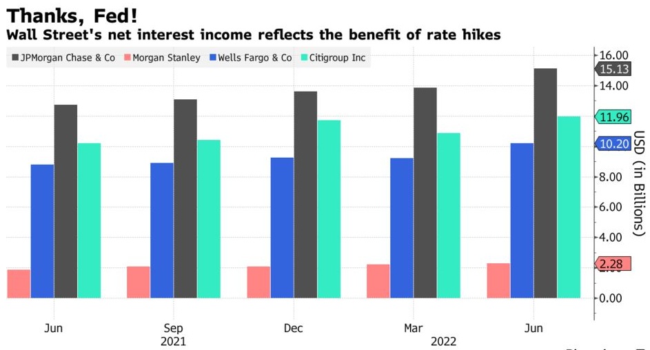 智通财经APP获悉,美联储遏制通货膨胀的举措提振了华尔街的银行。今年加息的好处显而易见,银行本周开始公布第二季度业绩,贷款收入和利润率有所改善,而此前数年借贷成本处于历史低位。四家已经公布财报的华尔街大行的净利息收入都超过了分析师的预期。