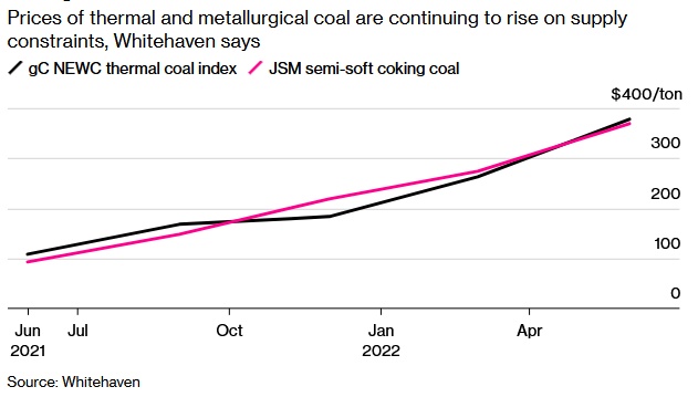 Whitehaven Coal在一份声明中指出,欧盟将于下月生效的对俄煤炭禁令“预计将进一步收紧高质量动力煤的供应。”“我们仍然认为,2022年至2023年,动力煤价格将受到良好支撑。”该公司表示,东北亚地区的煤炭消费者正在寻找货源,以便在夏季之前补充库存,而包括欧洲在内的非传统买家对澳大利亚煤炭的需求量也在增加。