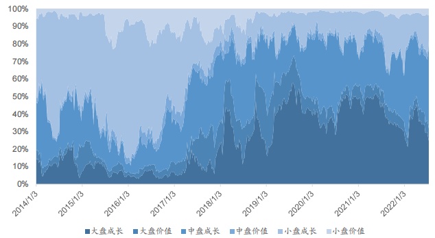 近三月来看,大盘成长仓位有显著降低,较2022.04.15配置比例降低18.12个百分点。近一月看,大盘价值风格仓位有所抬升;中盘价值仓位有所降低。