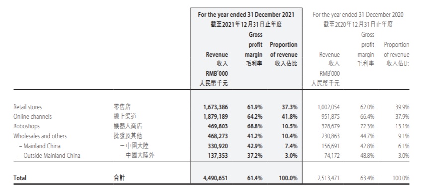就拿2021年的财报数据来看,2021年,该公司零售店录得收入为16.7亿元,同比增长67%,机器人商店录得收入为3.29亿元,同比增长42.9%,线上渠道录得收入为18.79亿元,同比增长97.4%。