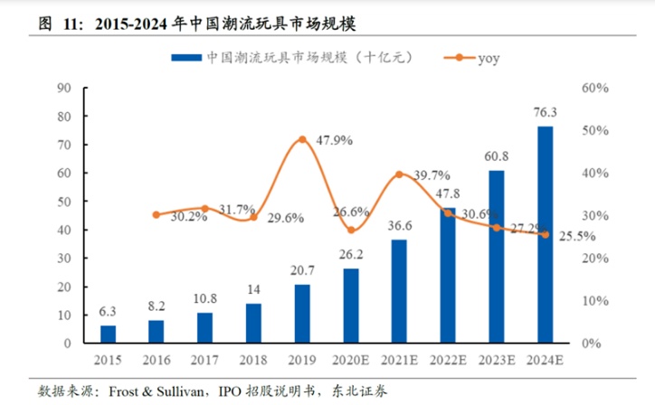 而中国的潮流玩具零售市场由于处于早期阶段,更是是实现了高双位数增长。据弗若斯特沙利文报告,中国潮流玩具零售的市场规模由2015年的63亿元增加至2019年的207亿元,复合年增长率为34.6%,占据全球潮玩市场的15%左右。受中国潮流玩具的受欢迎程度不断上升所推动,潮流玩具零售市场规模预期于2024年达到763亿元,复合年增长率为29.8%,预计2024年将占到全球潮玩市场的25%左右市场份额。